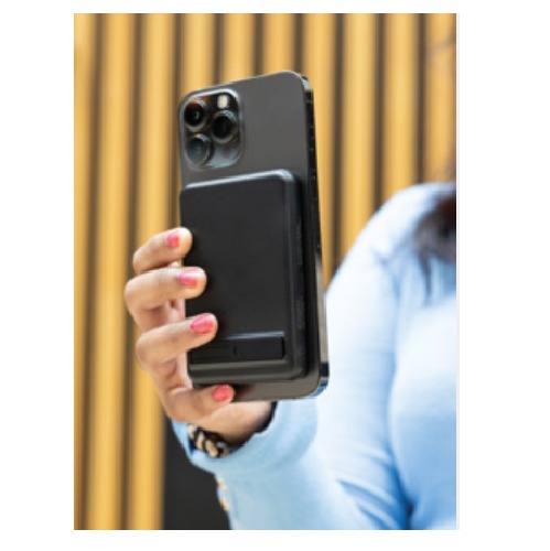 Le powerbank contient une batterie lithium-polymère longue durée de grade A de 5 000 mAh. Avec support de téléphone intégré.