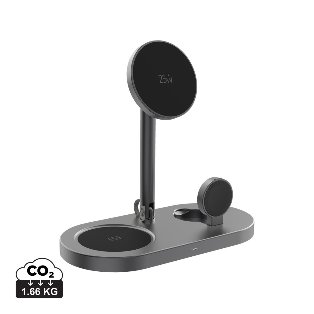 Découvrez la recharge sans fil magnétique ultra-rapide de 25 W avec Quantum Ultra-Fast 3-in-1, l’élégant chargeur de bureau qui alimente simultanément votre téléphone, votre Apple Watch/Samsung Watch et vos écouteurs. Son système assure une recharge stable de tous les appareils, grâce à une sécurité avancée et une protection thermique pour une utilisation quotidienne fiable. Fabriqué à partir d’ABS recyclé certifié RCS, d’aluminium recyclé et de PC recyclé. La norme RCS (Recycled Claim Standard) vérifie le contenu recyclé tout au long de la chaîne d’approvisionnement. Teneur totale en matériaux recyclés : 47% par rapport au poids total de l’article. L’entrée USB-C garantit une alimentation électrique constante pour une puissance optimale de 25 W. L’article et ses accessoires sont sans PVC et emballés dans un emballage kraft FSC® mix. Comprend un câble USB-C vers USB-C de 120 cm fabriqué à partir de TPE recyclé certifié RCS. Entrée minimale : 9 V/3 A pour une utilisation optimale.
