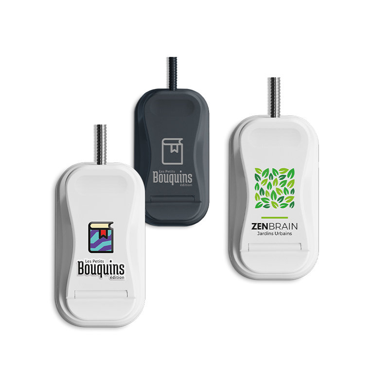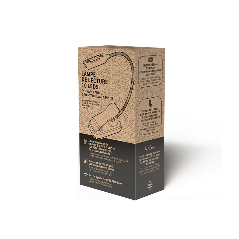 Avec notre liseuse à pince, plongez dans un monde de lumière sur-mesure, pensé pour vos instants de lecture de la première page au dernier chapitre. Dotée de 10 LED, elle vous offre trois niveaux d’intensité : un mode doux comme une veilleuse pour des soirées paisibles, un mode lecture pour des moments de détente, et une intensité éclatante pour des sessions de travail inspirées. Changez d’ambiance en un clin d’œil grâce aux trois températures de Couleur : une lumière apaisante qui filtre la lumière bleue pour des nuits sereines (1800 K), une teinte douce qui protège vos yeux pour une lecture tout confort (3400 K), et une luminosité énergisante qui stimule votre concentration (6000 K). Son col de cygne flexible en inox s’oriente à 360°, vous permettant de diriger le faisceau lumineux avec précision. Bouton ON/OFF et signal lumineux de la charge. Fonctionne avec une batterie Li-ion 650 mAh intégrée et rechargeable avec câble USB-C inclus. Son temps de charge est d’1h30 pour 8 à 80 h d’utilisation suivant le mode utilisé. Livrée en boite kraft individuelle illustrée. Marquage en 1 Couleur, argent conseillé et par défaut, Quadri-Transfert Relief, Quadri-Dôme ou Quadri-Numérique.