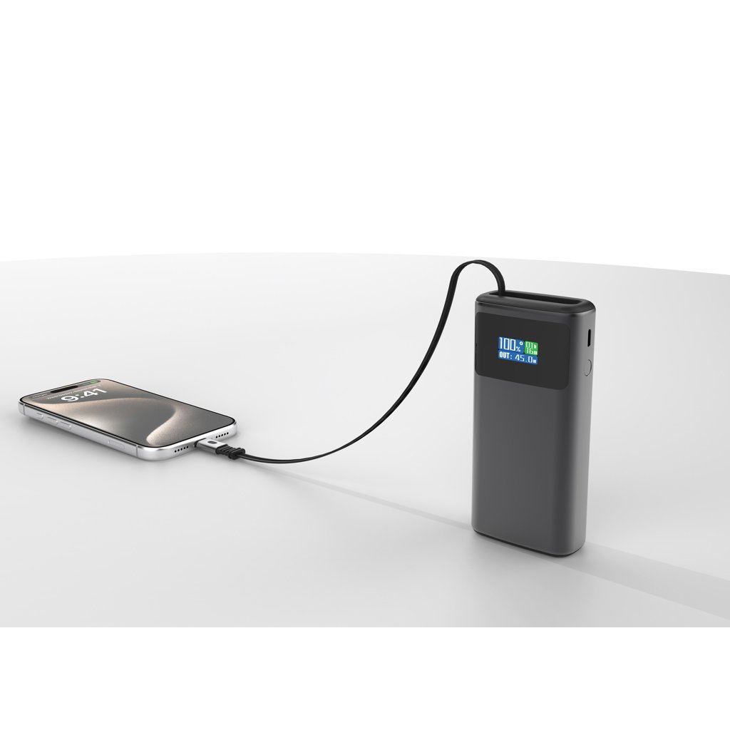 Profitez d’une recharge puissante lors de vos déplacements grâce à la batterie externe Quantum RCS 10 000 mAh 45 W, conçue pour les utilisateurs qui ont besoin d’une performance rapide et fiable dans un format compact. La batterie testée de qualité A offre une puissance stable, tandis que le port USB-C ultra-rapide de 45 W permet de recharger rapidement les téléphones, les tablettes et même les ordinateurs portables de manière modérée en cas d’urgence. Le câble USB-C rétractable intégré de 65 cm garantit une disponibilité instantanée sans enchevêtrement de fils, et l’écran TFT couleur affiche les données de recharge en temps réel pour un contrôle total. Fabriqué à partir d’ABS, de PC et de TPE recyclés certifiés RCS. La norme RCS (Recycled Claim Standard) vérifie le contenu recyclé tout au long de la chaîne d’approvisionnement. Contenu recyclé total : 39 % par rapport au poids total de l’article. L’article et ses accessoires sont sans PVC et emballés dans un emballage kraft FSC® mix.