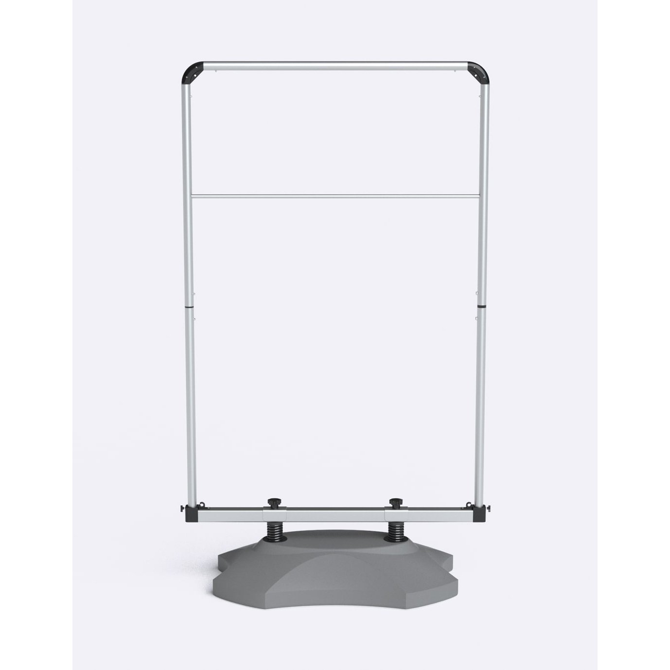 “Stop-trottoir personnalisé pour mise devant boutique, magasin. Ce stop-trottoir est conçu pour l’extérieur. Cette structure en tubes aluminium repose sur un pied en polypropylène de contenance 40L. Afin de diminuer la portance, la structure aluminium est montée sur des ressorts qui la relient au pied ; ces ressorts permettent au cadre aluminium de s’incliner en fonction du vent si besoin. L’habillage est réalisé dans une matière polyester 230g/m² ajourée pour laisser passer le vent. L’impression est réalisée d’office en recto/verso. Elle s’enfile sur la structure comme une housse.