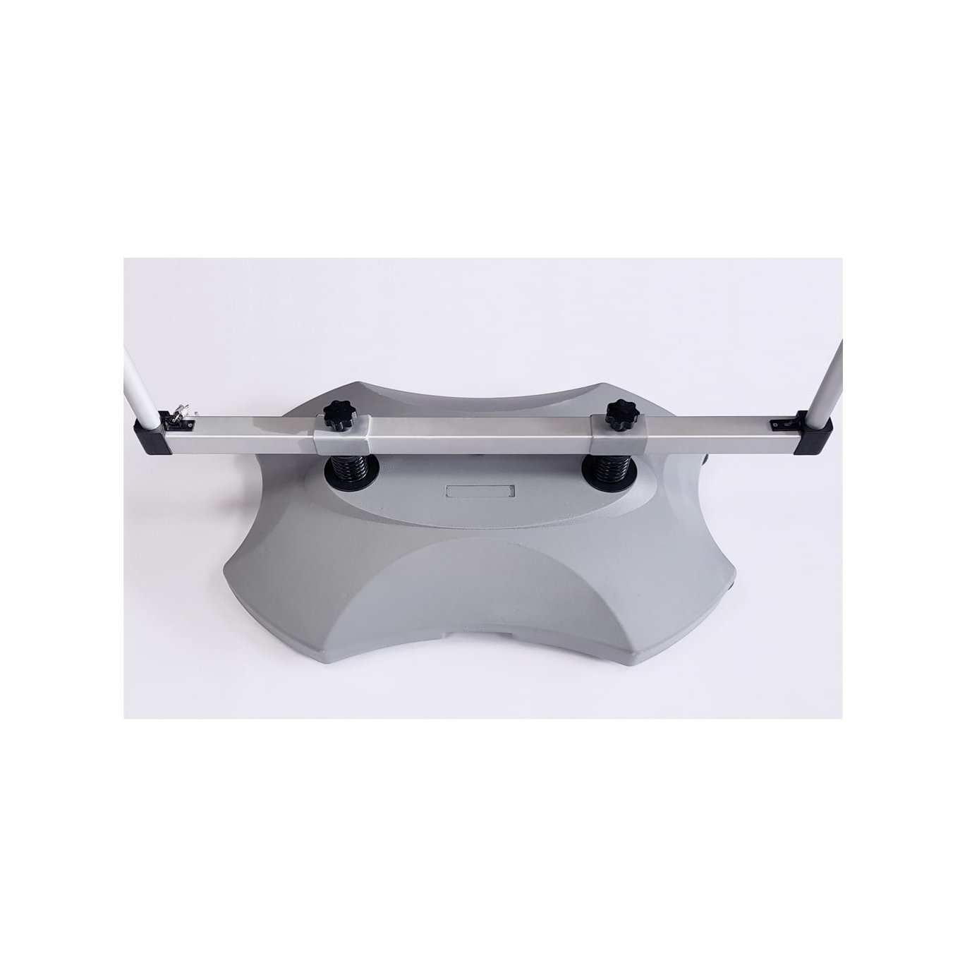 Les structures résistent à un vent maximum de force 7 (50kmh). Un pied de 40L pèse 1kg non rempli et 40kg rempli d’eau. Le pied dispose de roulettes pour le déplacer facilement une fois rempli avec son contenu.